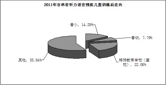 听力语言残疾儿童训练后走向所占比例为,普小14.29%,普幼7.79%,特教学校(聋校)22.08%,其他55.84%。