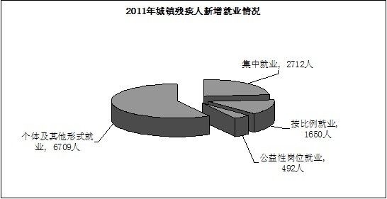 我省2011年城镇新安排1.16万残疾人就业。其中,集中就业残疾人2712人,按比例安排残疾人就业1650人,公益性岗位就业492人,个体及其它形式就业6709人,全省城镇实际在业残疾人15.49万人;30.53万农村残疾人稳定实现就业,其中从事农业生产劳动25.23万人。职业培训基地176个,其中残联兴办57个,依托社会机构兴办119个,本年度城镇职业培训人数1.16万人。 培训盲人保健按摩896人;医疗按摩人员195,保健按摩机构达到305个,医疗按摩机构达到37个;有26人和54人通过医疗按摩人员中级和初级职称评审;有777名盲人按摩人员实现就业,其中保健按摩人员690人,医疗按摩人员87人,全省各级残联扶持284名特困盲人按摩师实现就业。