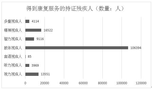 2017年,154226名残疾儿童及持证残疾人得到基本康复服务,其中国家建档立卡贫困残疾人18009名,因病致(返)贫残疾人20470名。得到康复服务的持证残疾人中,有视力残疾人13551名、听力残疾人3969名、言语残疾人85名、肢体残疾人106394名、智力残疾人9116名、精神残疾人16522名、多重残疾人4114名。