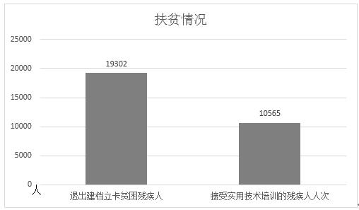 全国残疾人脱贫攻坚取得阶段性成果,贫困残疾人得到有效扶持,其中19302人通过扶贫开发实际脱贫;接受实用技术培训的残疾人达到10565人次。