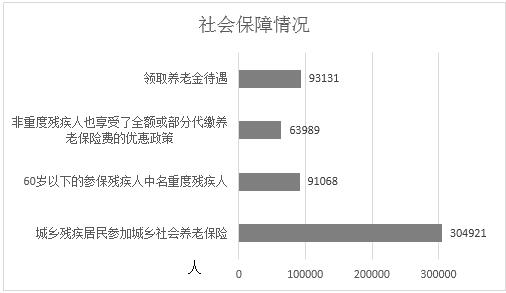 截至2017年底,城乡残疾居民参加城乡社会养老保险人数达到304921名,91068名60岁以下的重度残疾人参保,其中85870名得到了政府的参保扶助,代缴养老保险费比例达到94.3%。有63989名非重度残疾人也享受了全额或部分代缴养老保险费的优惠政策。93131人领取养老金。