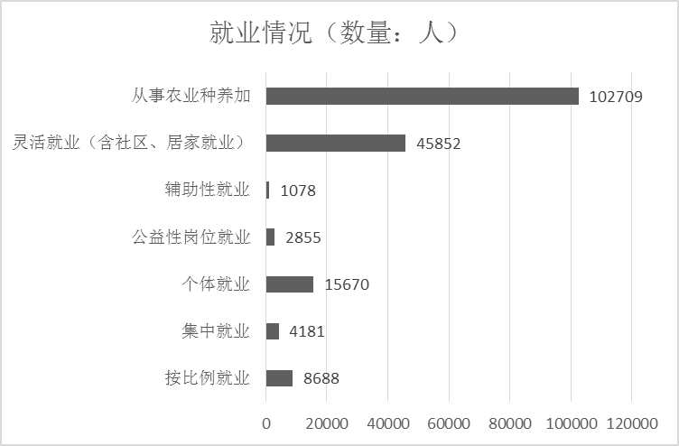 城乡持证残疾人就业人数为181033人,其中按比例就业8688人,集中就业4181人,个体就业15670人,公益性岗位就业2855人,辅助性就业1078人,灵活就业(含社区、居家就业)45852人,从事农业种养加102709人。