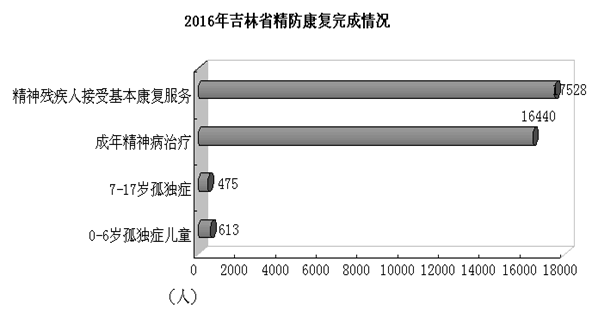(三)精神残疾康复(含孤独症儿童)。在全省大力推广“社会化、综合性、开放式”精神病防治康复工作,为17,528名精神病患者提供基本康复服务,其中0-6岁孤独症儿童613名,7-17岁孤独症475名,成年精神残疾人16,440名。