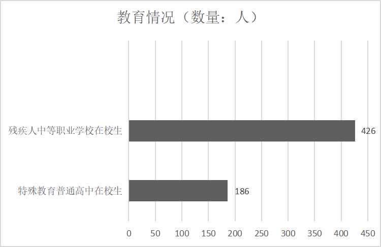 共有特殊教育普通高中5个,在校生186人,其中聋生72人,其他114人。残疾人中等职业学校2个,在校生426人,毕业生67人。高等教育阶段,招收889名残疾学生,其中高职317人、 本科496人、硕士研究生69人、博士研究生7人。