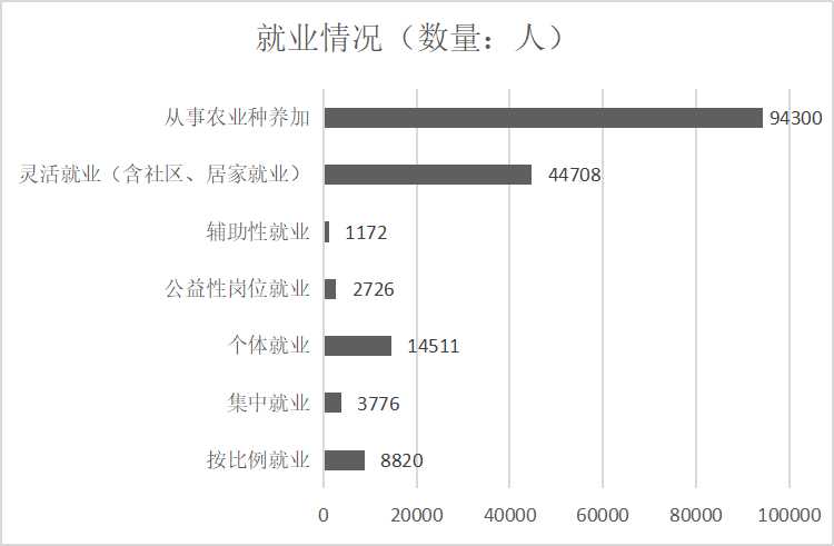 城乡持证残疾人就业人数为170013人,其中按比例就业8820人,集中就业3776人,个体就业14511人,公益性岗位就业2726人,辅助性就业1172人,灵活就业(含社区、居家就业)44708人,从事农业种养加94300人。