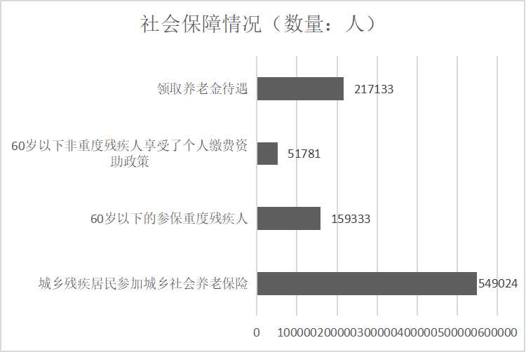 截至2023年底,参加城乡居民基本养老保险的残疾人有549024名。217133名残疾人领取养老金。60岁以下参保的残疾人中,159333名重度残疾人和51781名非重度残疾人得到参保缴费资助。